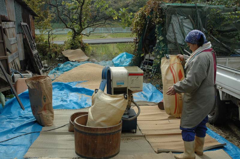 庭先での黒川産の新米もみすり作業