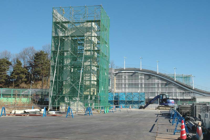 13人乗りのエレベータを駅前の空き地で組み立て、3月末までに大型クレーンで線路脇の跨線橋に運んで接続する予定。