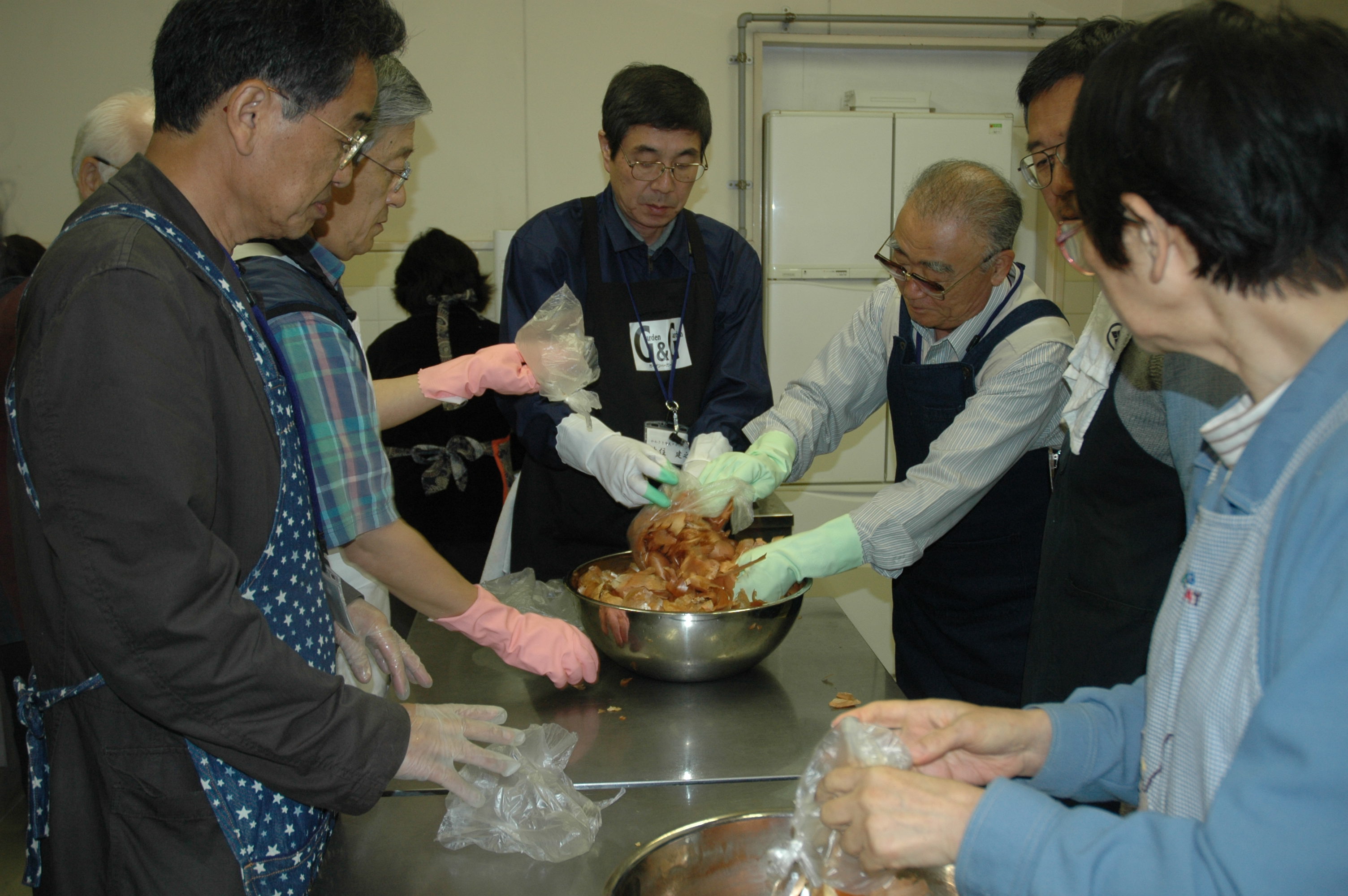 参加者は各自が好みで工夫し、シルクの生地に糸や輪ゴムで好きな場所を縛って模様をつける「糸絞り」や、生地そのものを丸めて絞ったりして模様を付ける「結び絞り」を試みて、染めた色の仕上がりと、生地に意識的に付けた模様・柄の仕上がりを批評しあって楽しんだ。(写真:材料の玉葱の皮)