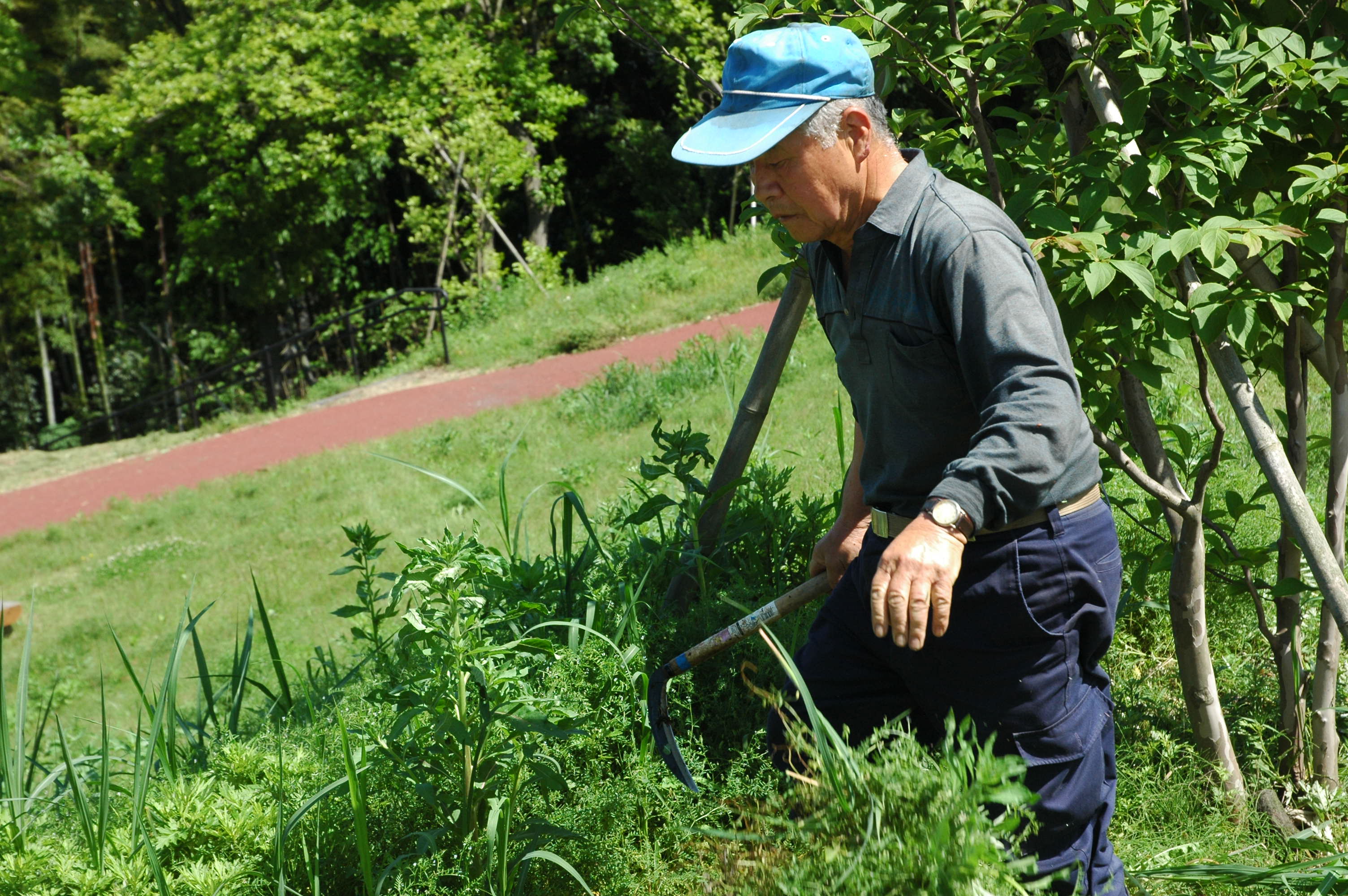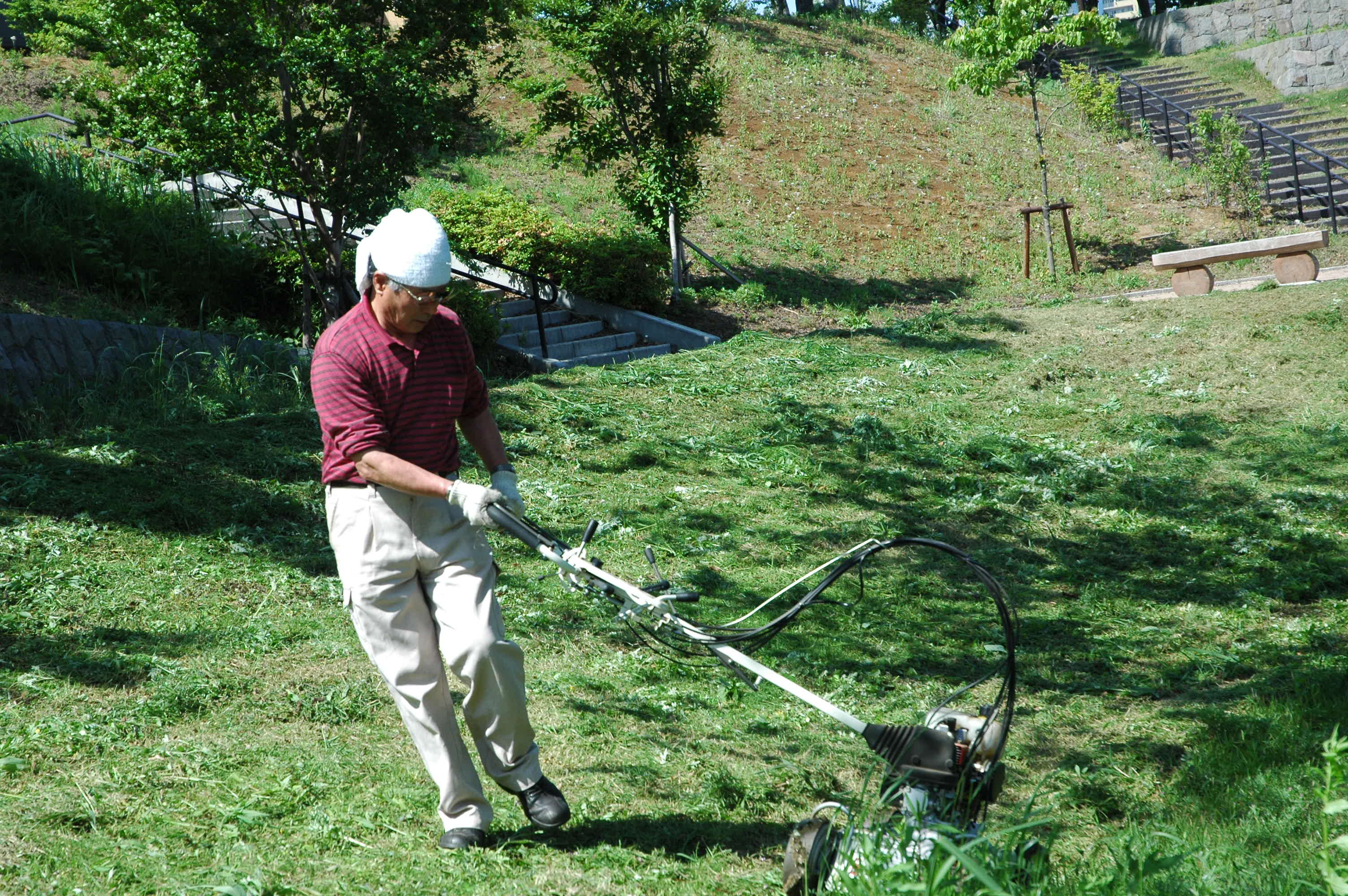 自然の空気と素晴らしい景色の中で、日頃のストレスを忘れさせる公園、積もった心の疲れを癒す公園、犬の散歩で訪れる公園ですが、立夏も過ぎ暖かい陽光に誘われて公園の夏草の成長が著しく鬱陶(うっとう)しくなってきていました。