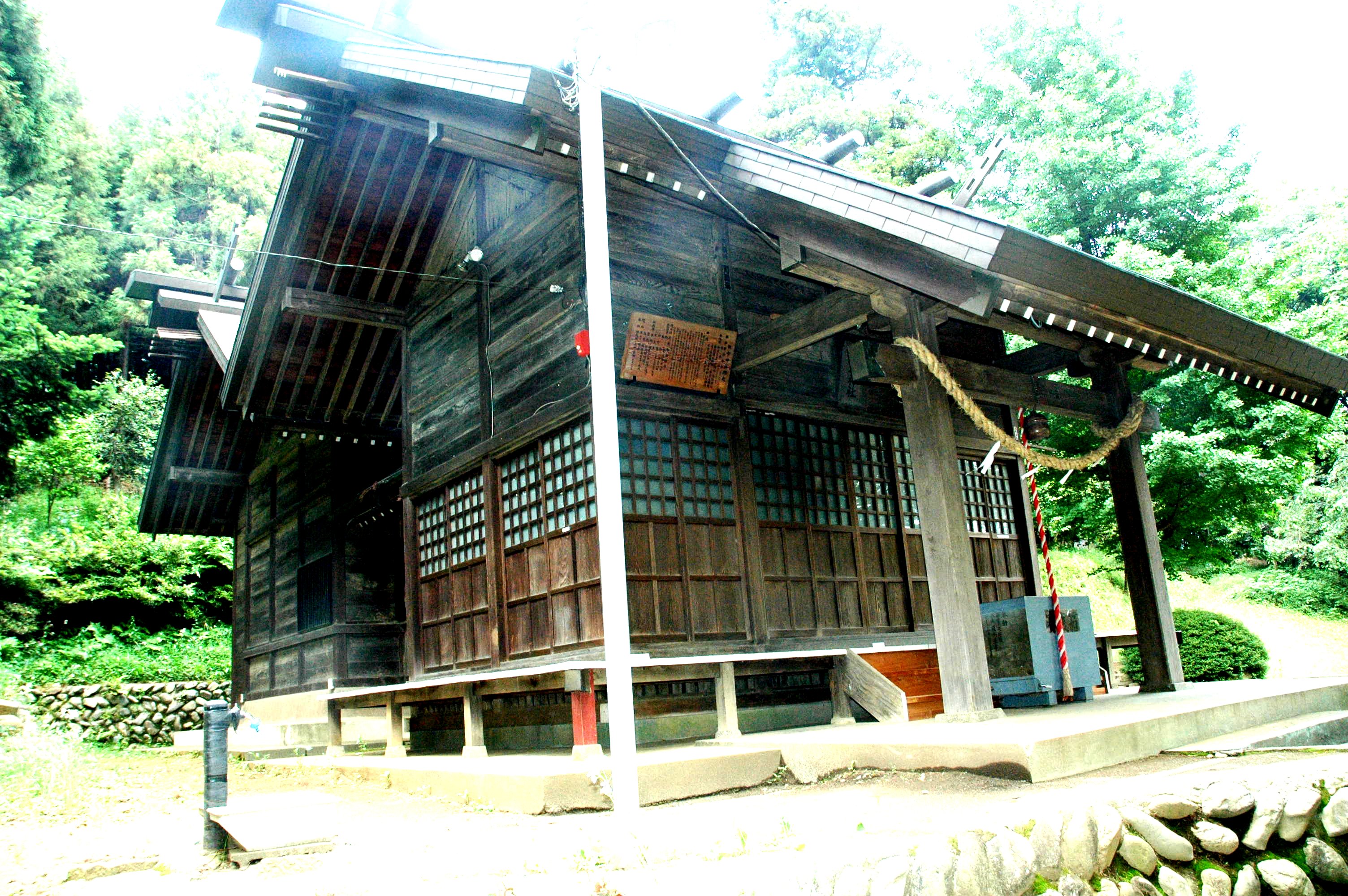 木の鳥居をくぐると直ぐに左前に巨大な欅の木がそびえ立っています。ものさしで測ってみたところ、周囲は4.7mありました。私の計算が間違っていなければ、直系はおよそ1.5mということになります。町田市の保存樹に指定されています。