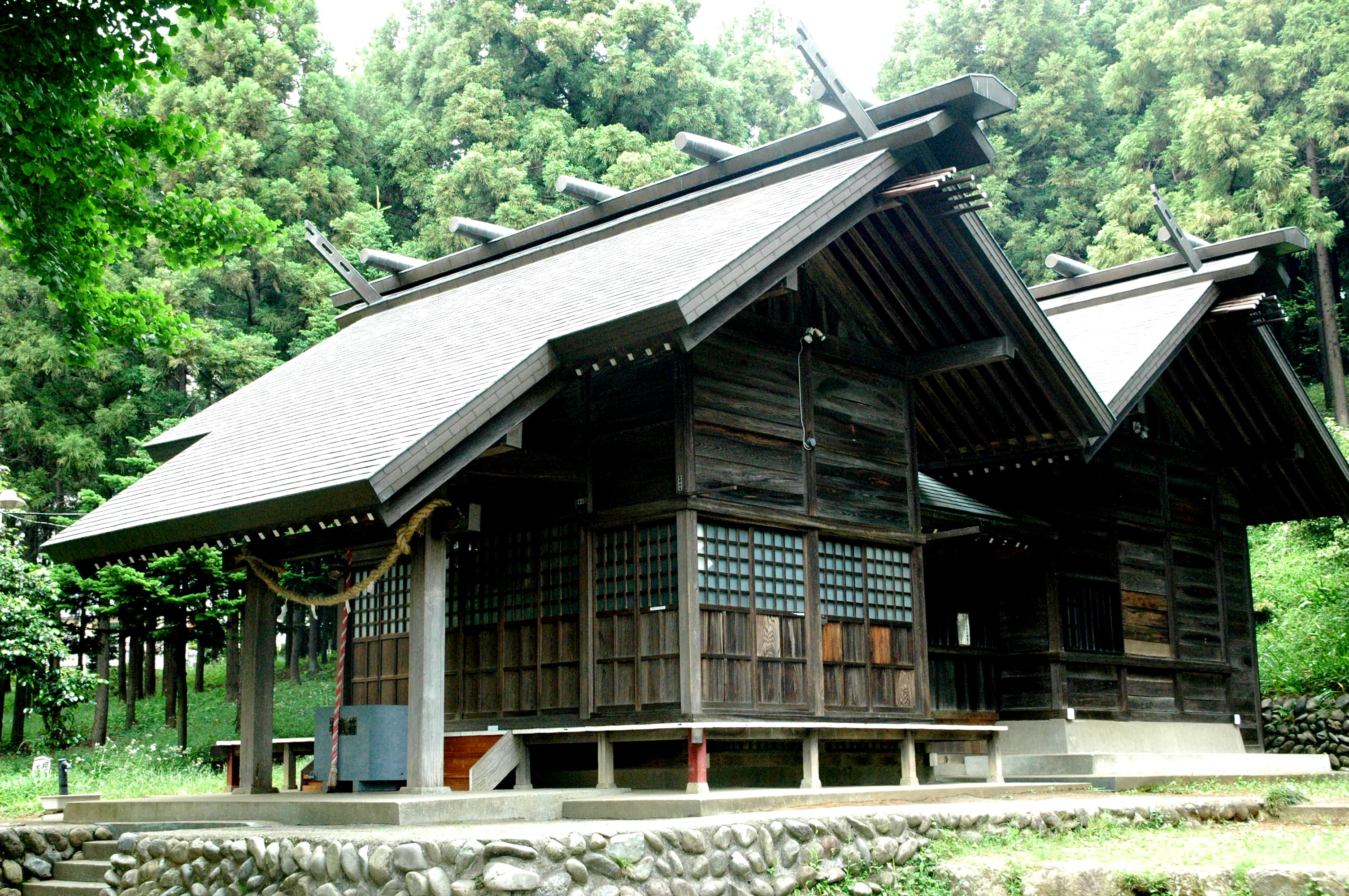 写真でご覧のように、神社の屋根に特徴があります。二つの屋根が印象的です。