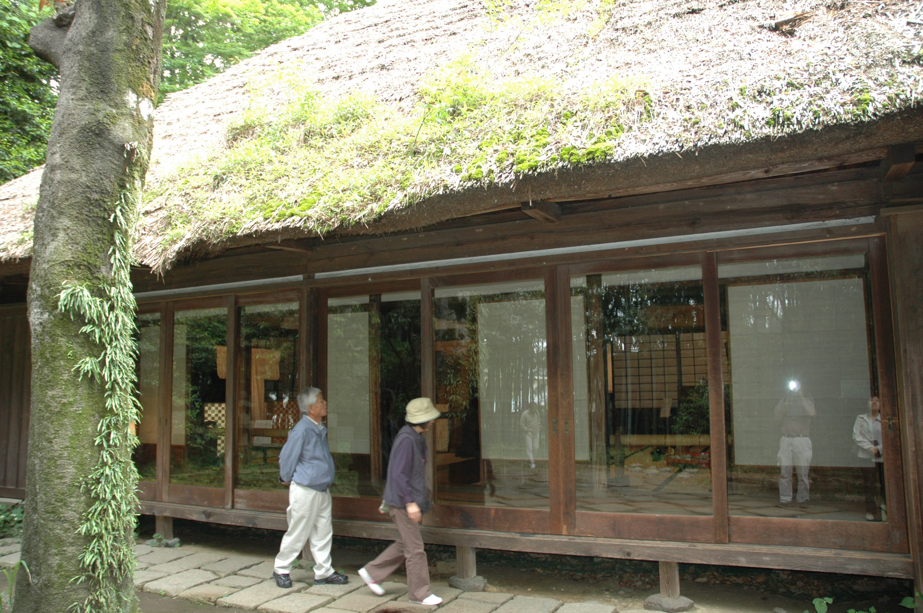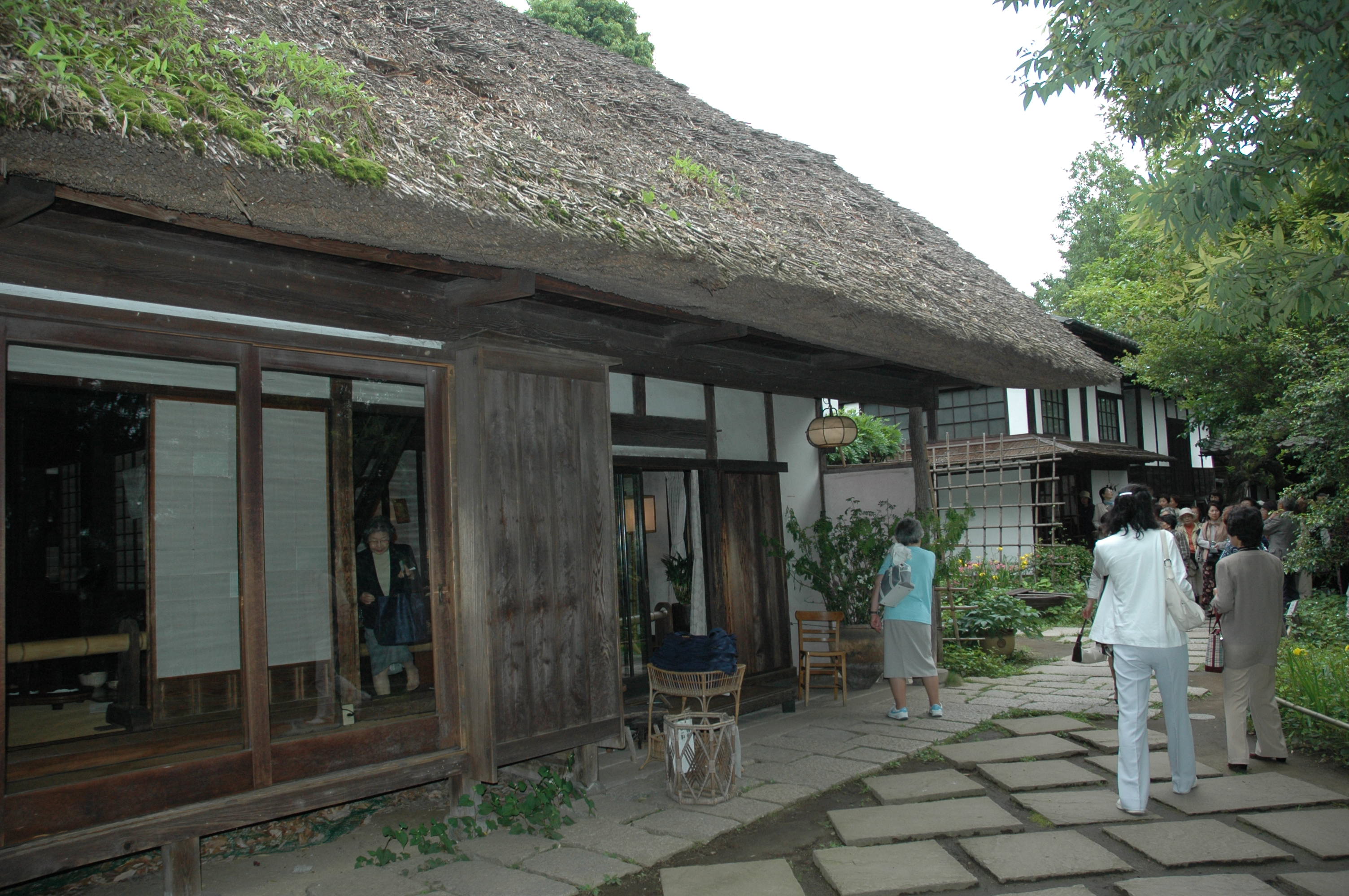 武相荘に入ると懐かしい農家の建物です。藁葺き屋根で黒光りする大黒柱、磨き上げられた床板など、自分が住んでいた昔の農家と間取りがほとんど同じだったのには驚きました。鶴川の南斜面の小高い丘の斜面に建てられていて、庭には高さ10m以上もの禅寺丸柿の木が、緑色の葉を付けているこの付近の典型的な農家風情。