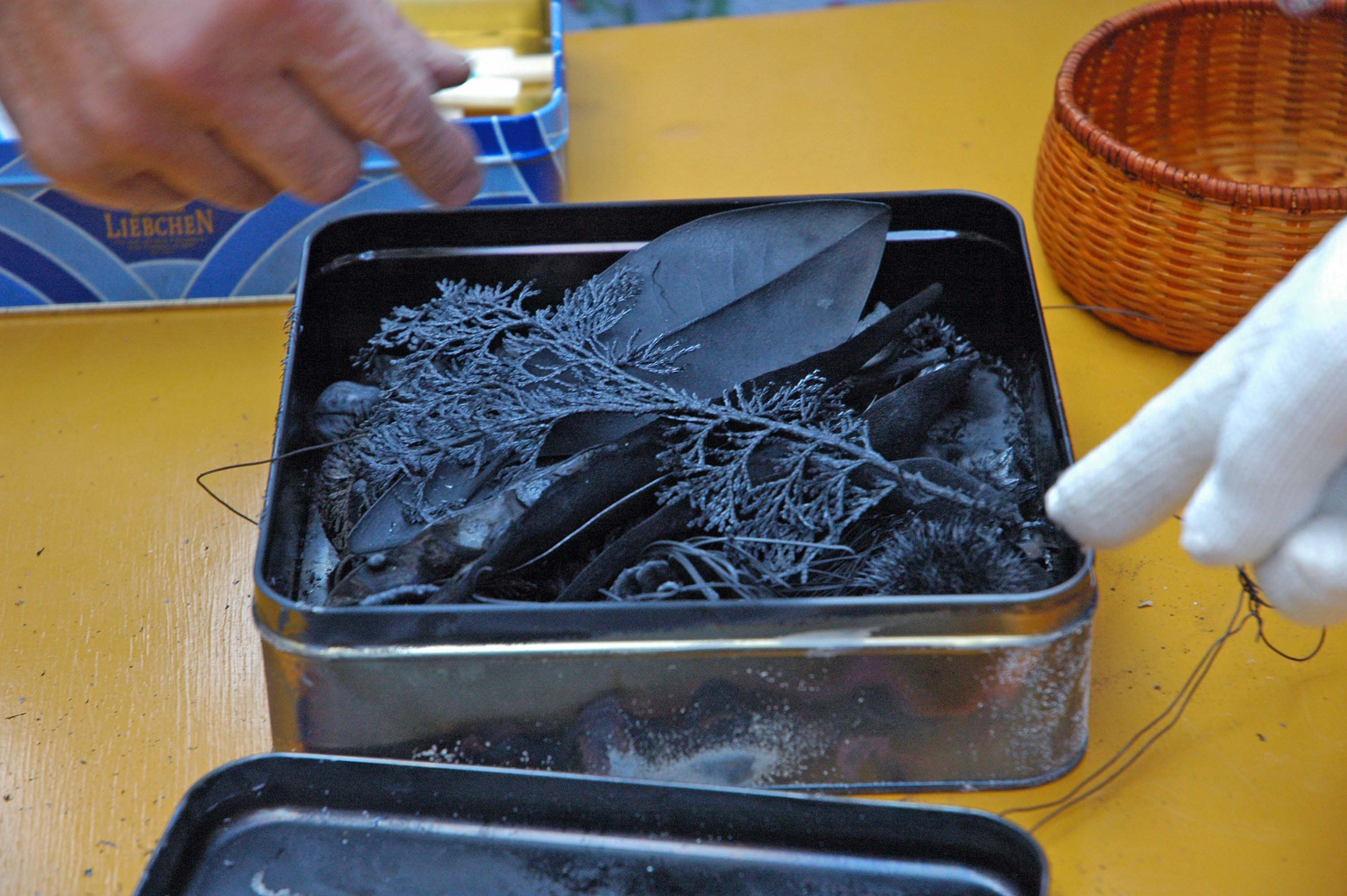 5.缶が冷えたら、蓋をあけて材料を取り出す。手袋などをして取り出すと壊れるので、割り箸などで丁寧に取り出す。材料がくっついていることがあるので、慎重にとりだす。 花炭の完成!! 完成後の花炭は、最初に詰め込んだときの5分の3ぐらいの体積になっていて、従量も軽くなっている。