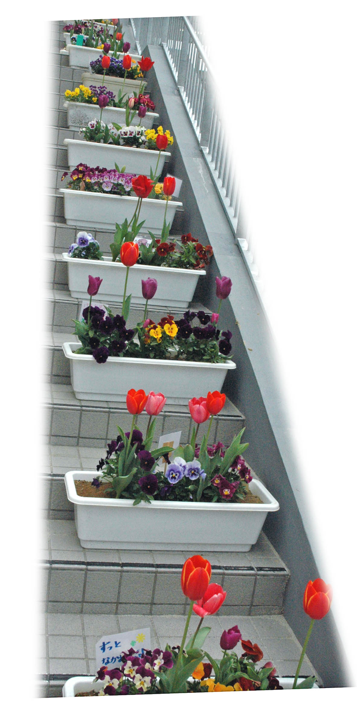 (写真:新校舎外階段に置かれた春の花々)