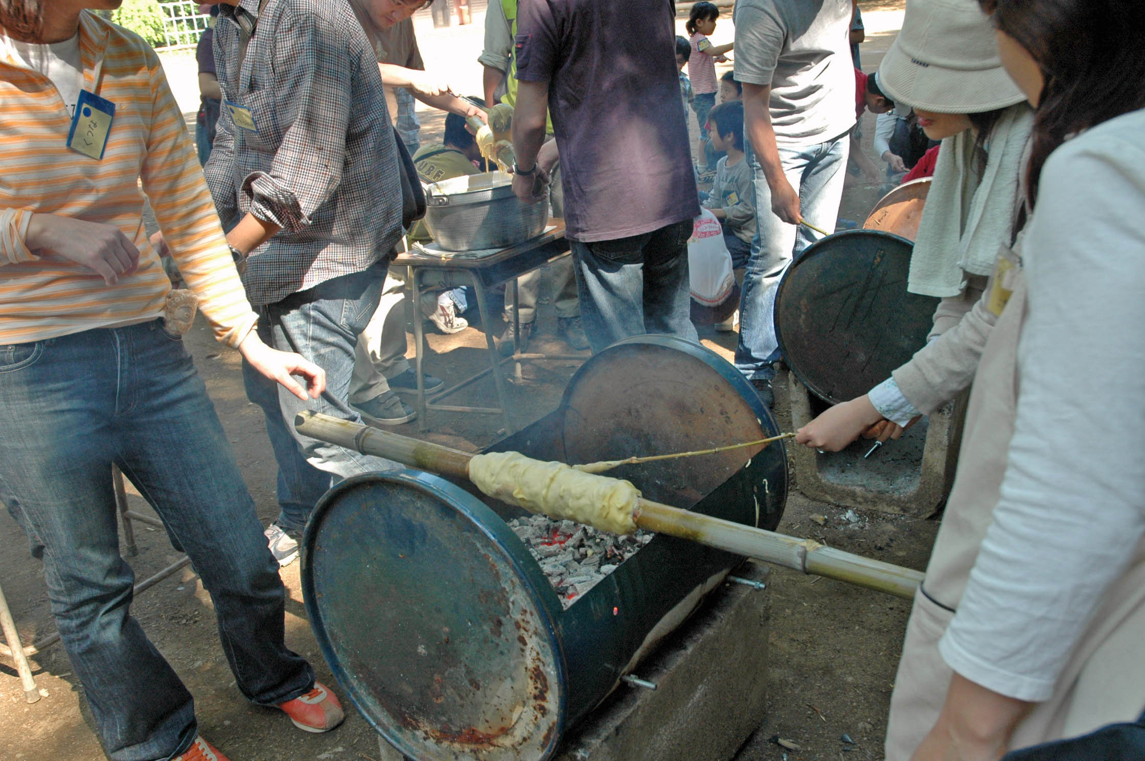 大人は太い生竹を芯にして、大きなバウムクーヘンを、子ども達は細い竹を使って小さなバウムクーヘン作りを楽しむ。