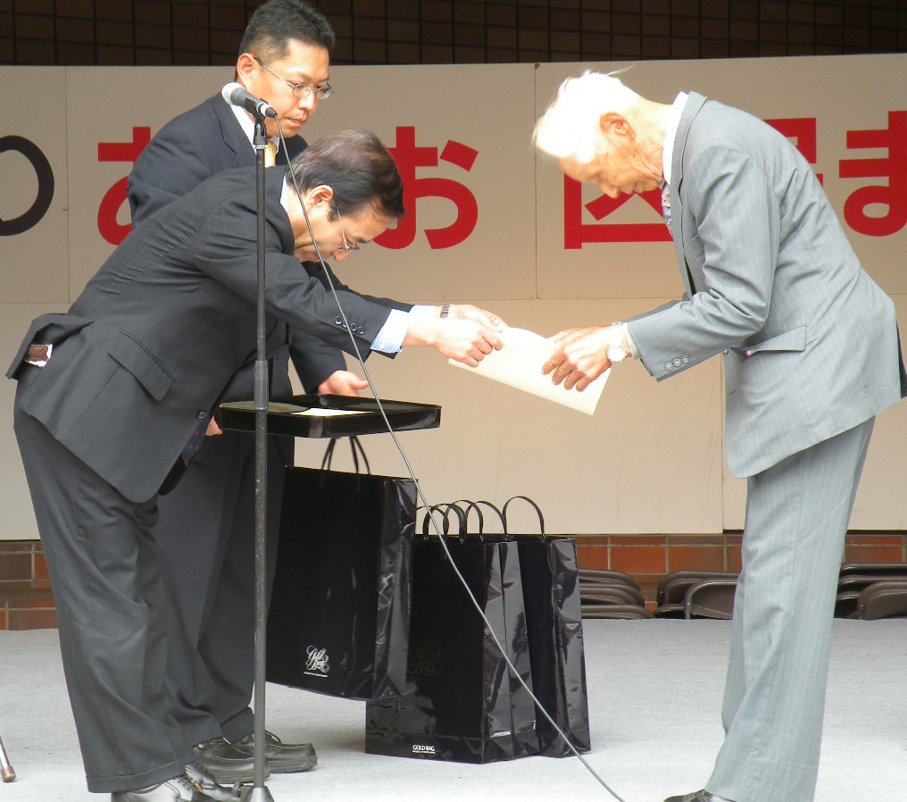 今年度から麻生区に功労があった方に対して、麻生区役所では「麻生区地域功労賞」を制定し、その第一回の表彰式が麻生区民祭で挙行され、4人の功労者が太田麻生区長から表彰された。
