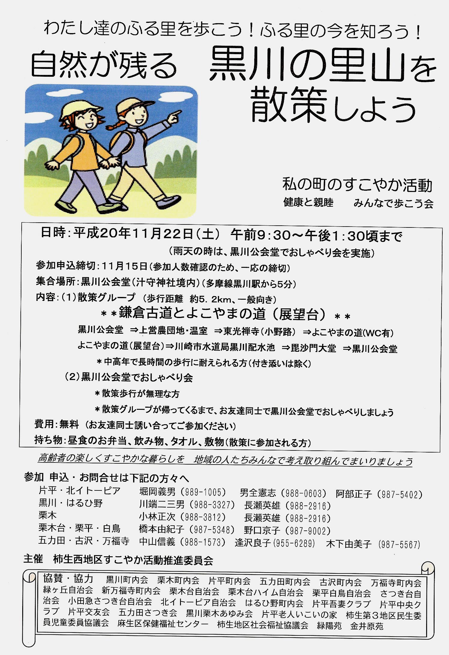 黒川地区にお住まいであっても、なかなか近くにある散策コースを歩かれたことがないのではないでしょうか。飛び込み参加も大歓迎ですので、お友達をお誘いの上、是非参加して下さい。