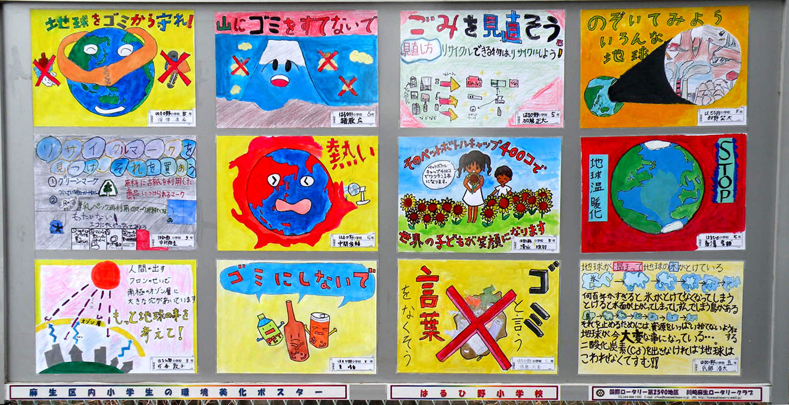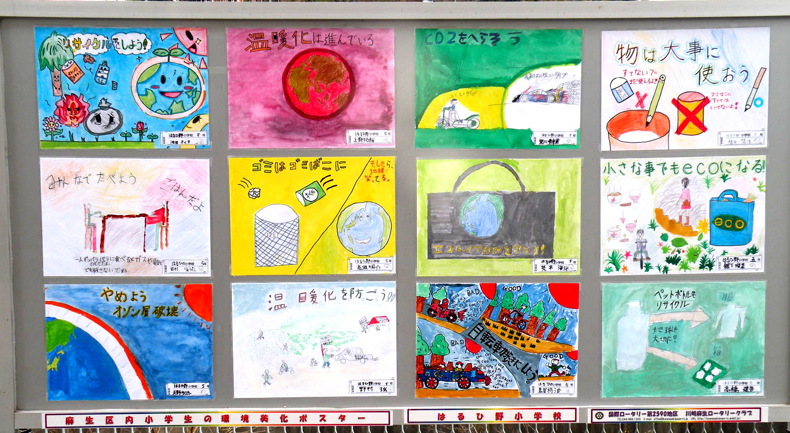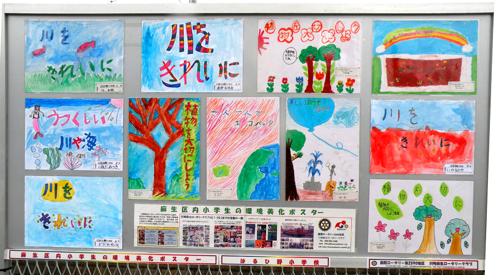 これは川崎麻生ロータリークラブが麻生区内の小学生に『環境について考えてもらおう』という趣旨で1998年から行っているプログラムで、今年から昨春開校したはるひ野小学校の児童の絵が新たに加わった。