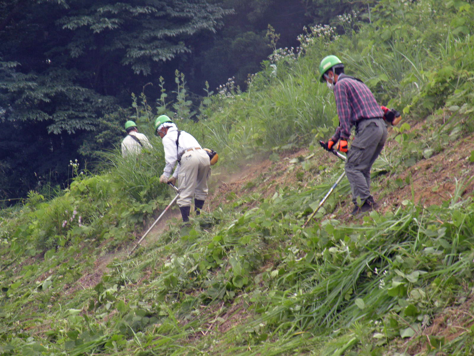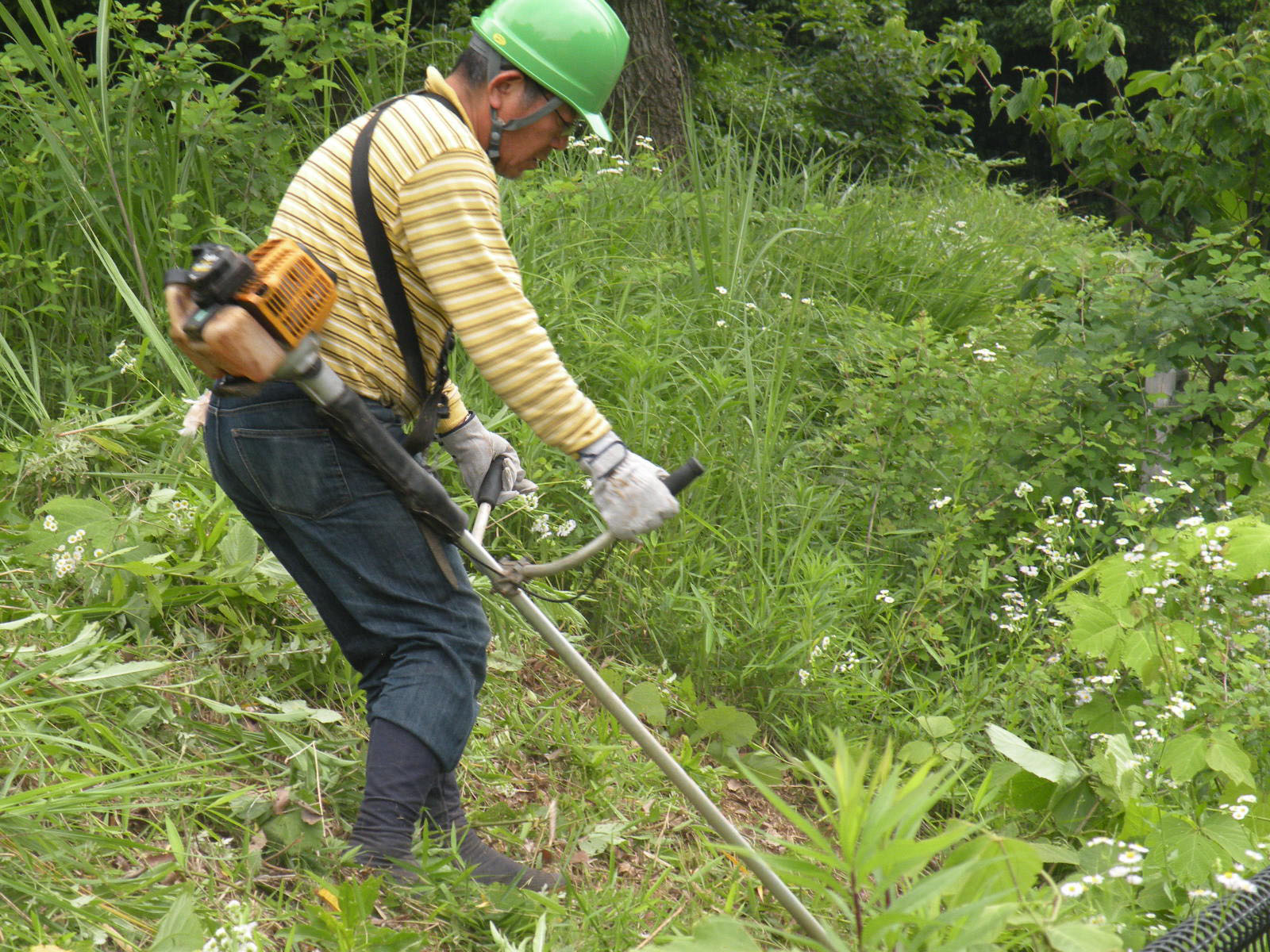 農家にとっては水田の植田作業、トマト、キュウリ、ジャガイモ、玉ねぎ等の野菜出荷の最盛期にもかかわらず組合員が20名も参加し、各自が所有する刈り払い機等の除草機材を持ち込み、一心不乱に作業に当たった。