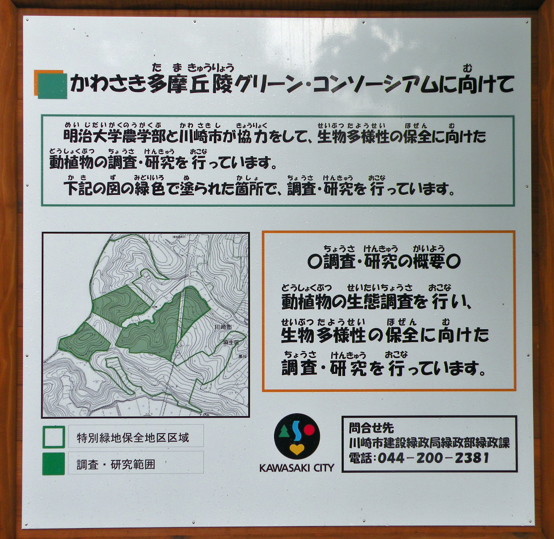 明治大学農学部と川崎市が協力して、かわさき多摩丘陵の生物多様性の保全に向けた動植物の調査・研究がおこなわれています。