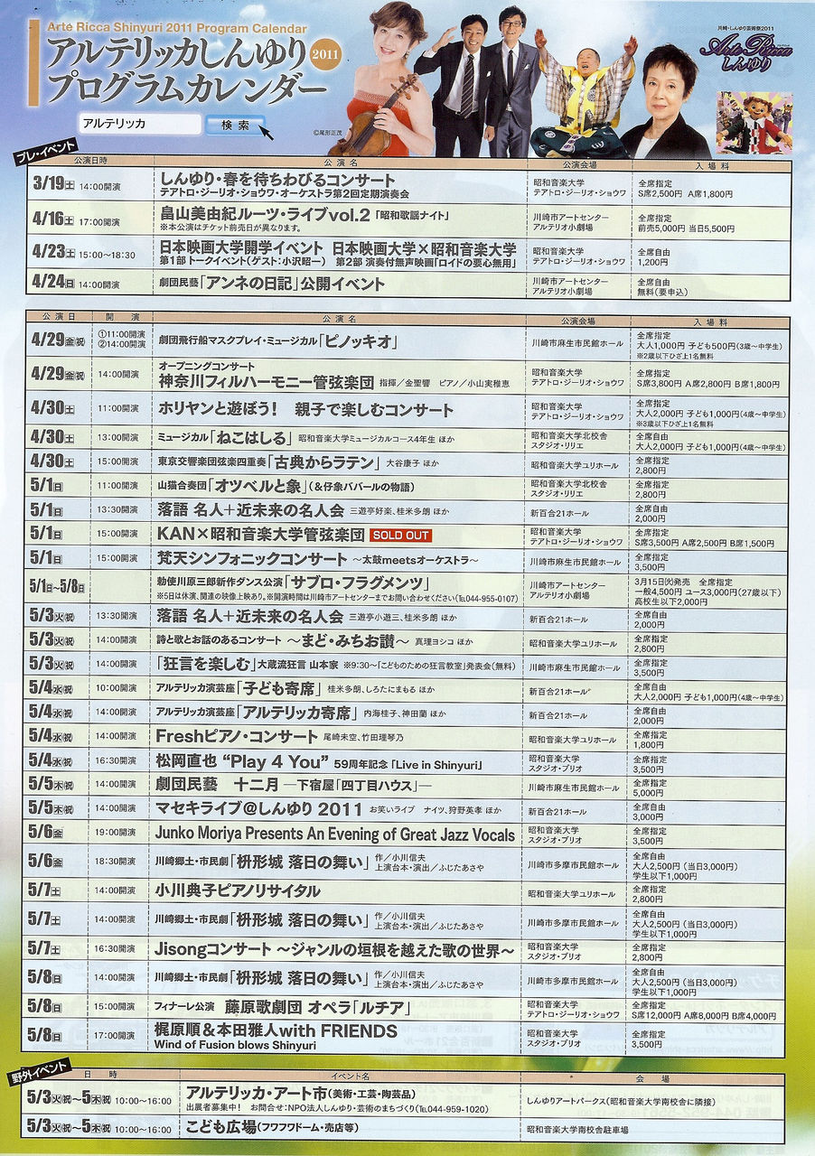 新百合ヶ丘駅周辺の会場では、子どもから大人まで、コンサート・狂言・オペラ・落語・新劇(劇団民藝)・市民劇・ピアノリサイタル・ミュージカル・JAZZ等々、幅広い芸術が楽しめる『アルテリッカしんゆり2011』のプログラムが待っています。