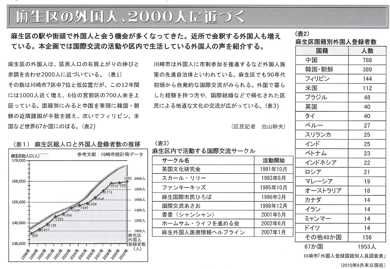 いささか旧聞に属するが、麻生区にお住いの外国人に関するデータを、「やまゆりニュース第4号(NPO法人あさお市民活動サポートセンター発行)」から転載いたします。