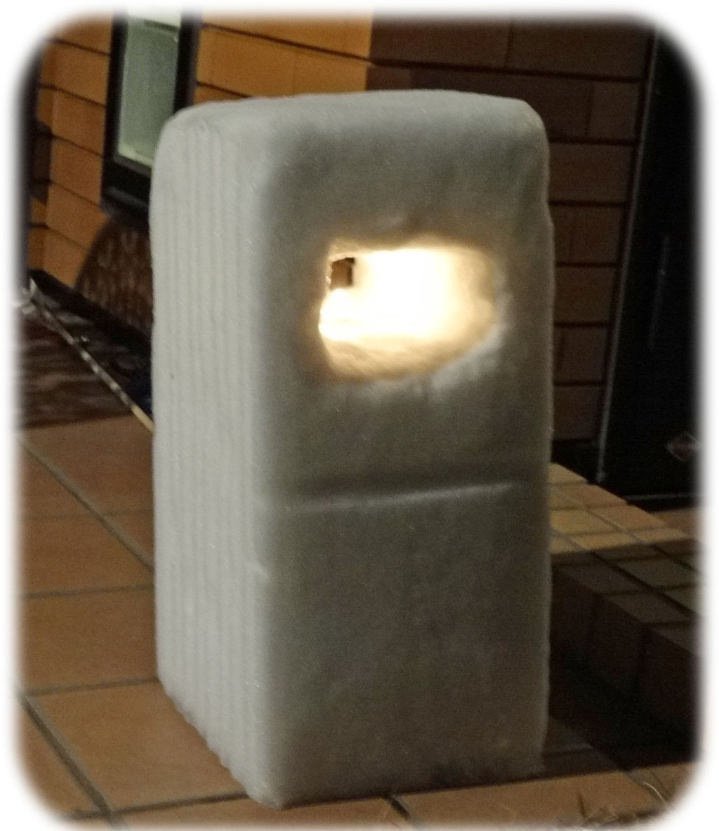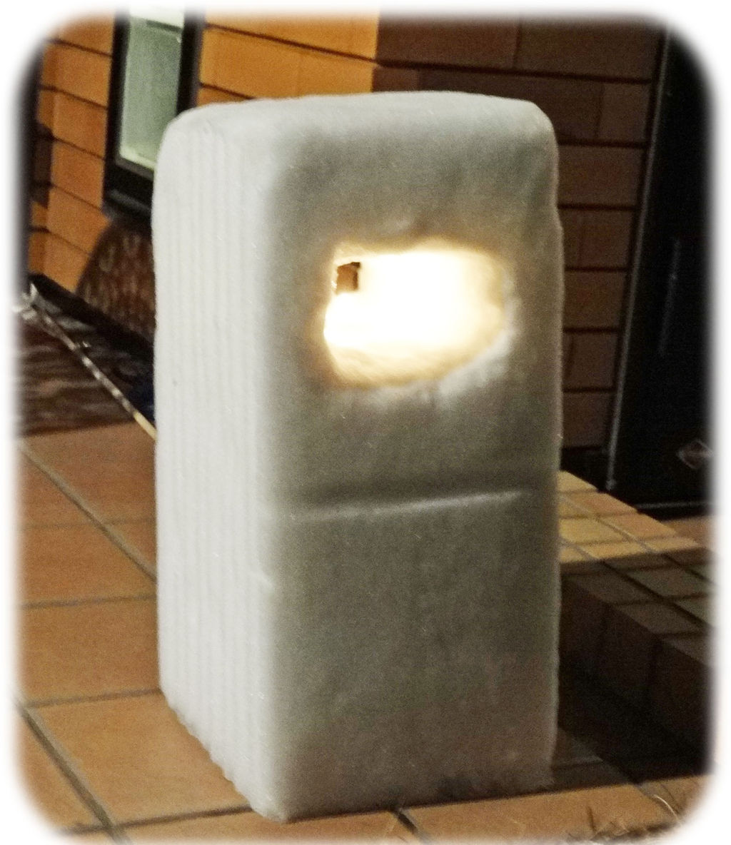 雪だるまの上の方に窓があり、そこにロウソクを灯すと、米沢・上杉雪灯篭まつり の雰囲気になる。