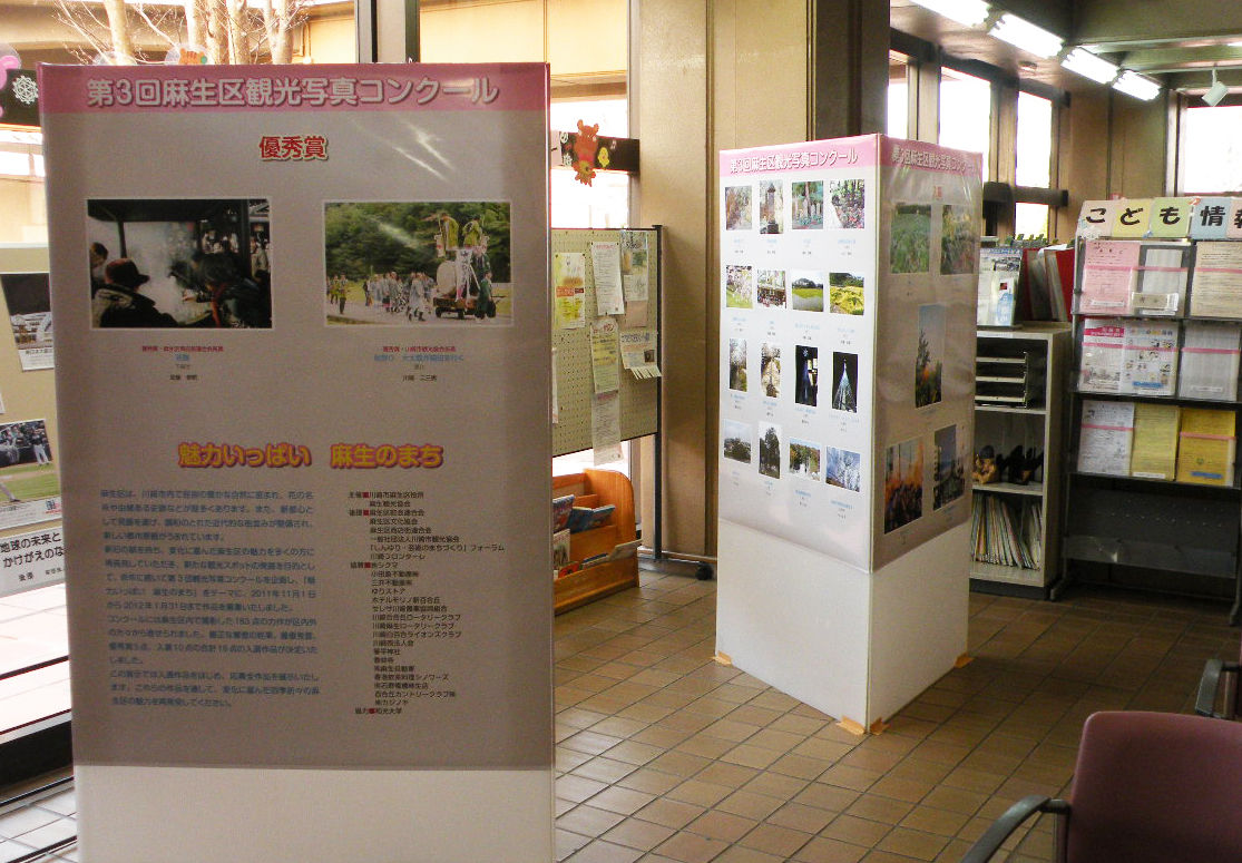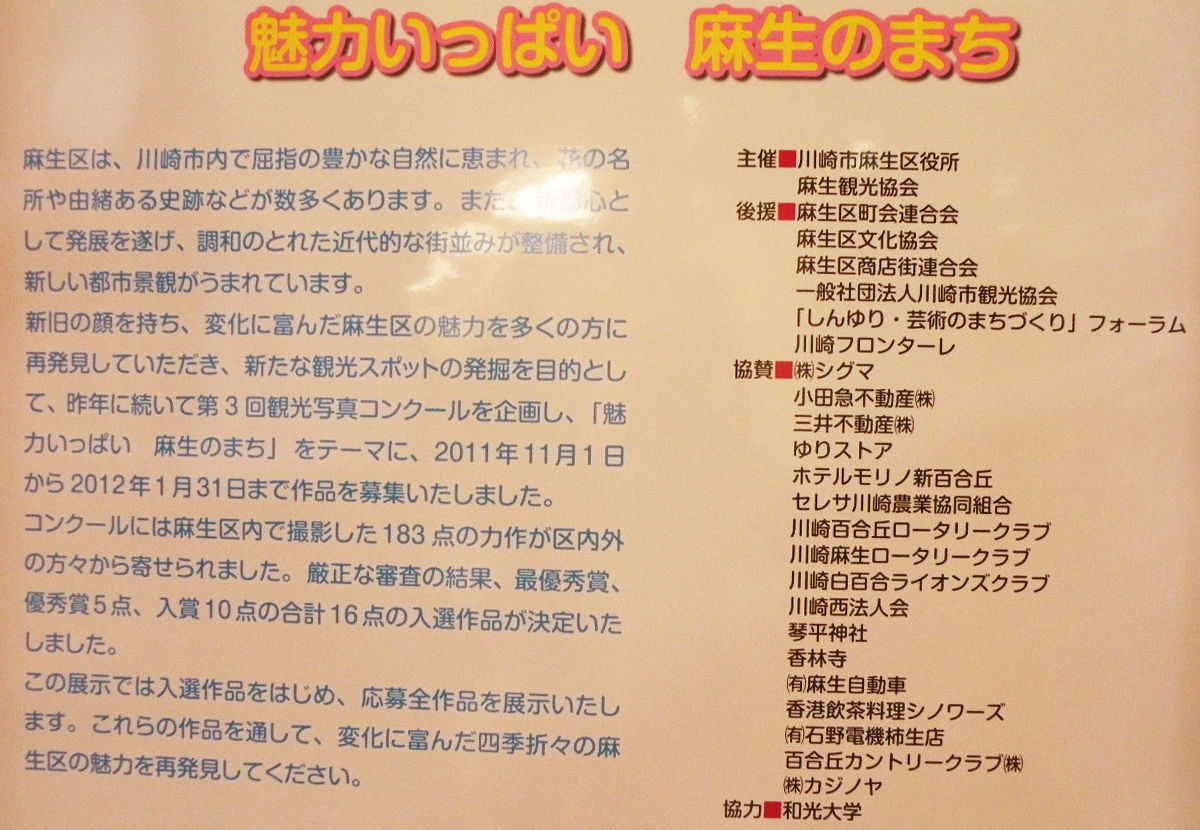 平成23年度第3回麻生観光協会「麻生観光写真コンクール」に応募した全作品183点(最優秀賞作品1点、優秀賞作品5点、入選作品10点を含む)が、3月19日から麻生区役所2階ロビーに展示されました。