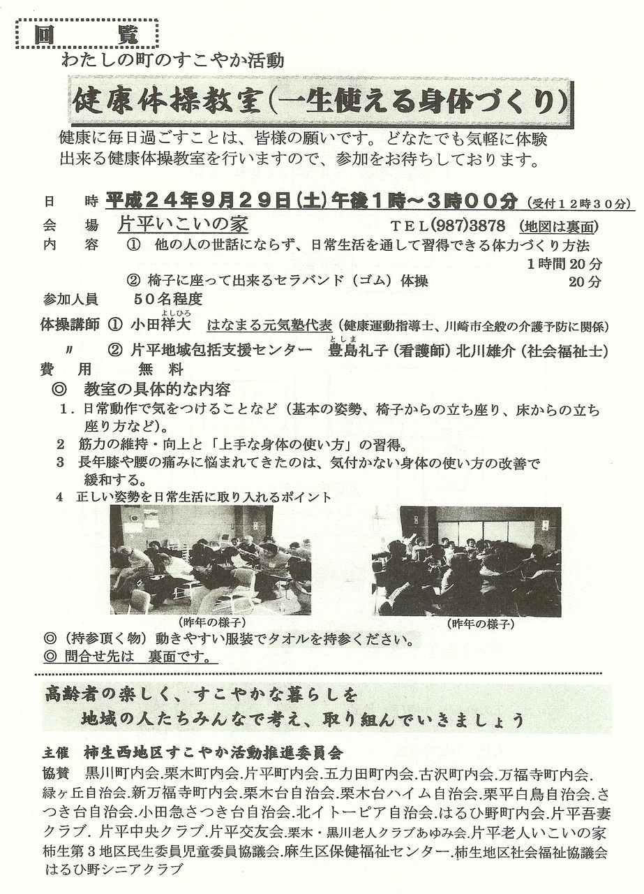 「健康体操教室(一生使える身体づくり)」が、9月9日(土)に片平老人いこいの家で開催されます。