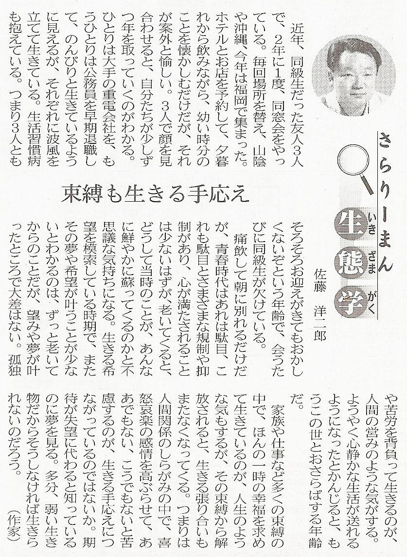 日本経済新聞H25.5.15朝刊 「サラリーマン生態学(いきざまがく)」コーナーに、作家 佐藤洋二郎氏の『束縛も生きる手応え』という記事が掲載された。