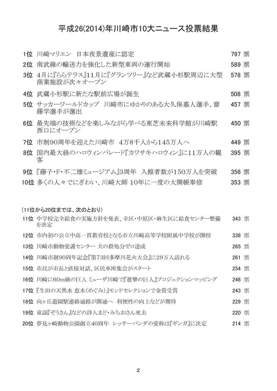 川崎市から平成26年(2014)の10大ニュースが12月24日に発表されました。