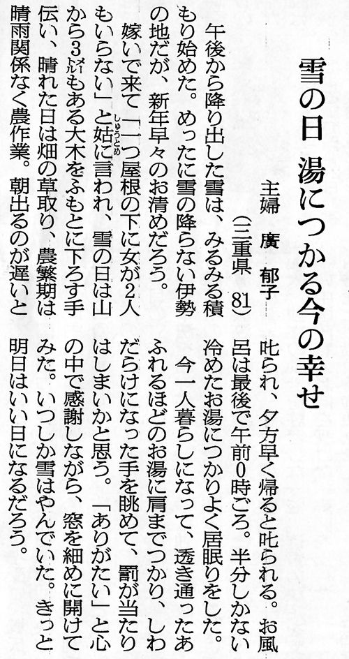 朝日新聞1月28日(日)朝刊 声欄に ほのぼのした投稿が目に留まりました。