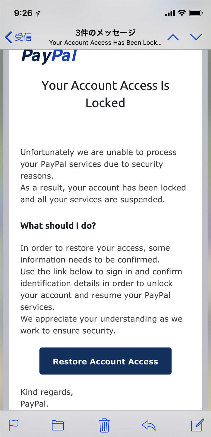 「PayPal Your Account Access Is Locked」という書き出しで始まるものでPayPal社が発信したように装っている。