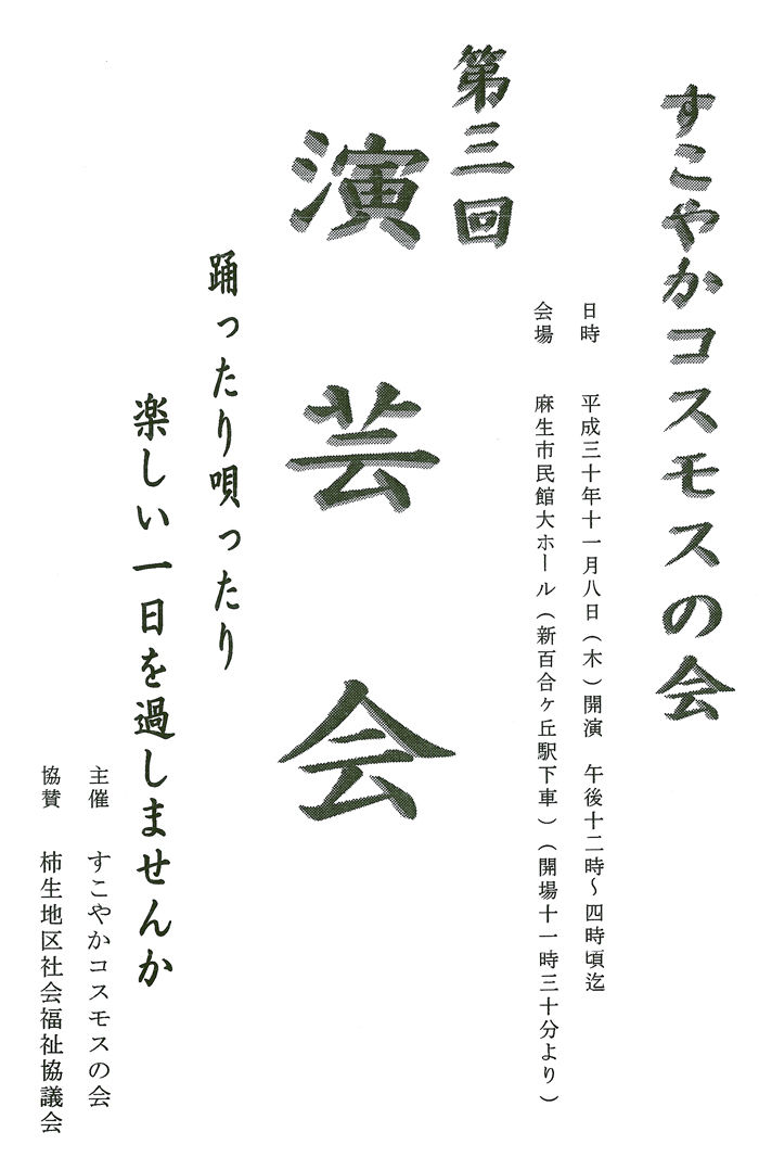 主催は「すこやかコスモスの会」、「柿生地区社会福祉協議会」が協賛で開催される第三回演芸会です。