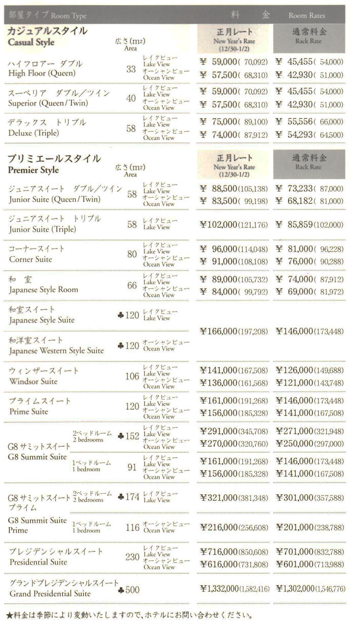 最高は グランドプレジデンシャルスィート \1,302,000.-