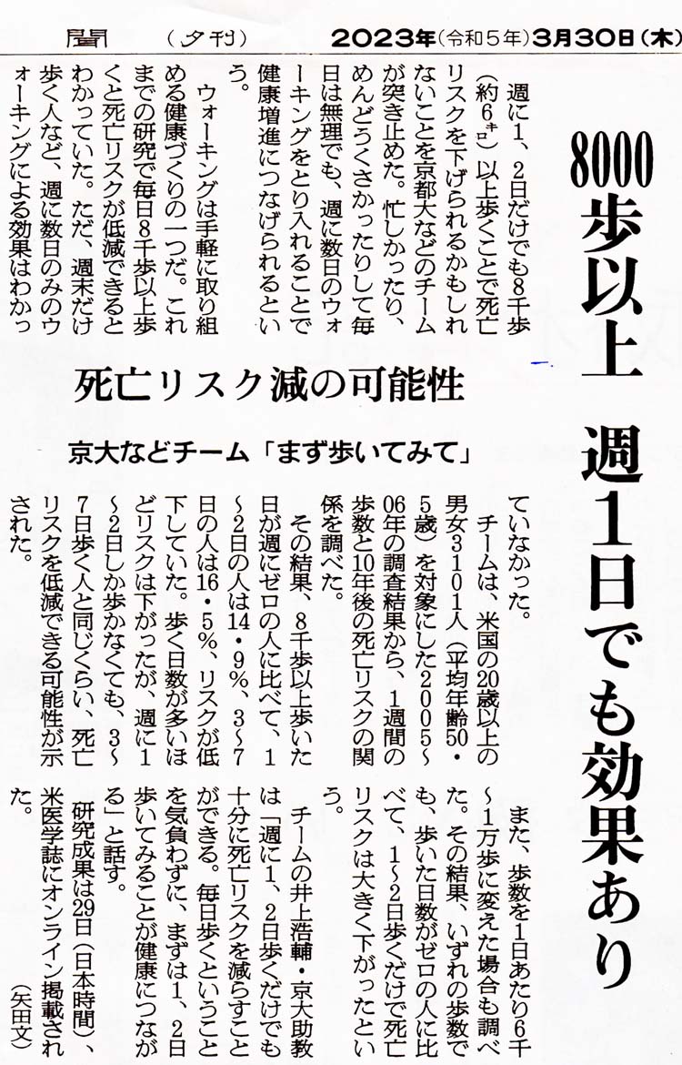 「週に1、2回だけでも8千歩以上歩くだけで死亡リスクを下げられるかもしれない」という内容の記事でした。