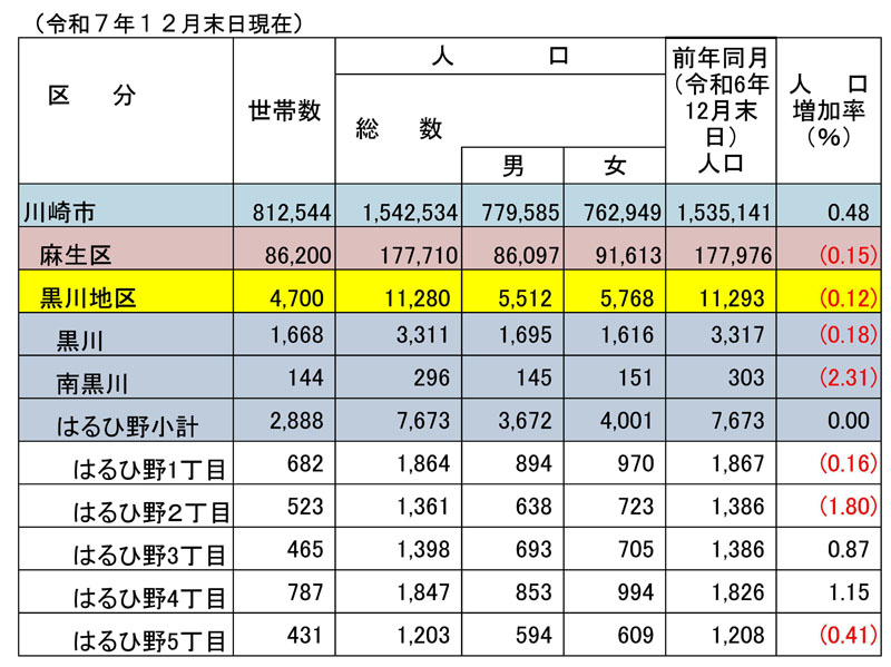 令和7年12月末日現在の黒川・はるひ野の最新人口データが 26日に発表されました。麻生区を含め黒川・南黒川・はるひ野の1丁目、2丁目、5丁目までで